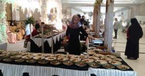 Tampilan prasmanan degan unsur kayu tradisional dan menambahkan kesan modern.